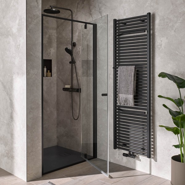 Die Nischentür ist drehbar und lässt sich so mit Anschlagseite links wie rechts nach Wunsch montieren.