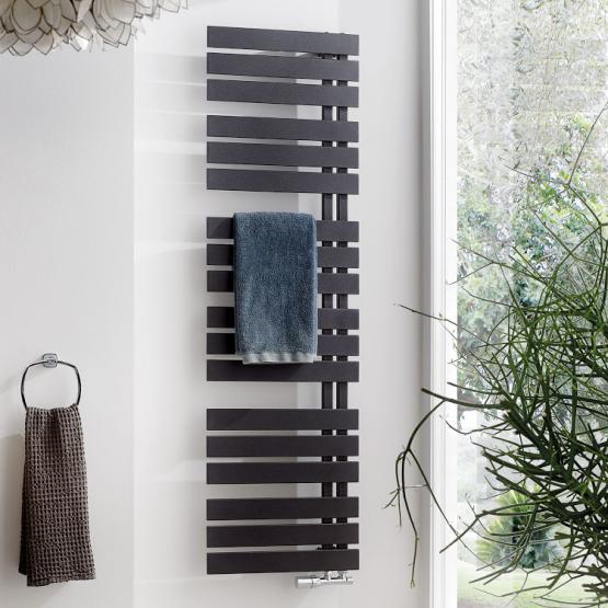Der neue HSK-Designheizkörper Yenga bietet Chic und Funktionalität fürs Bad. Die offene Anordnung der Heizlamellen ermöglicht das bequeme Überhängen der Handtücher von der Seite. Die Position des Heizstabs ist unten rechts.