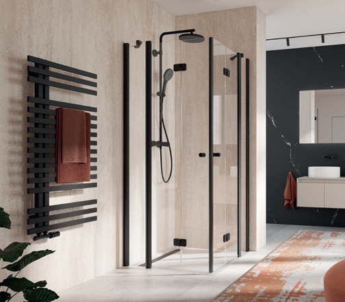 HSK Duschkabine EXKLUSIV 2.0 ECKEINSTIEG DREHFALTTÜR PENDELBAR AN NEBENTEIL Klar hell | 100 x 100 cm | Schwarz-matt
